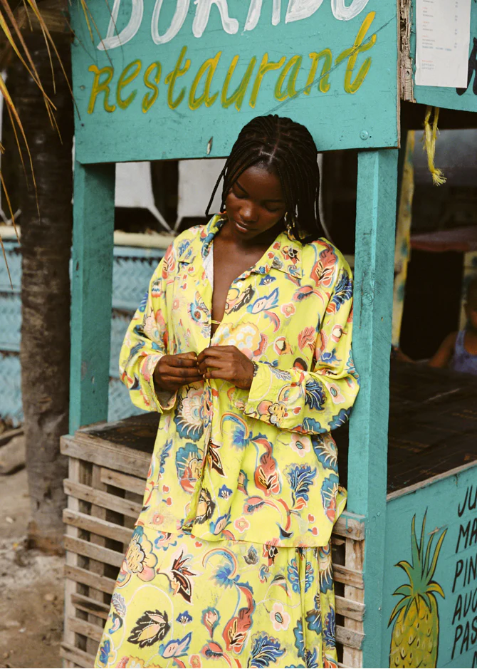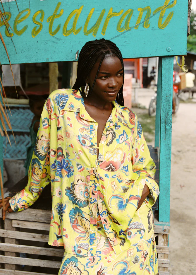 The Bacio Di Mare Dorato Shirt in vibrant sunshine yellow by Kinga Csilla is a stunning celebration of bold resort style. This luxurious piece features intricate hand-drawn floral and paisley print in rich jewel tones of cobalt blue, coral, and rose, creating a captivating tapestry of colour and detail. A flattering button-up featuring long sleeves and a deep V-neckline. Pair with the matching Bacio Di Mare Notte Skirt for a charming set. This handcrafted shirt drapes beautifully and transitions effortlessly from beachside lunches to sunset gatherings.