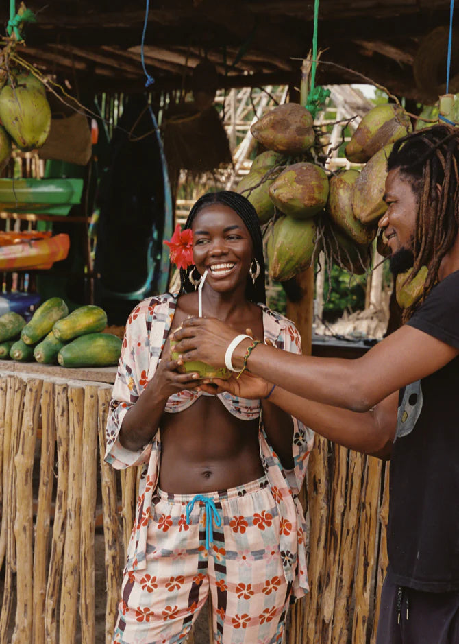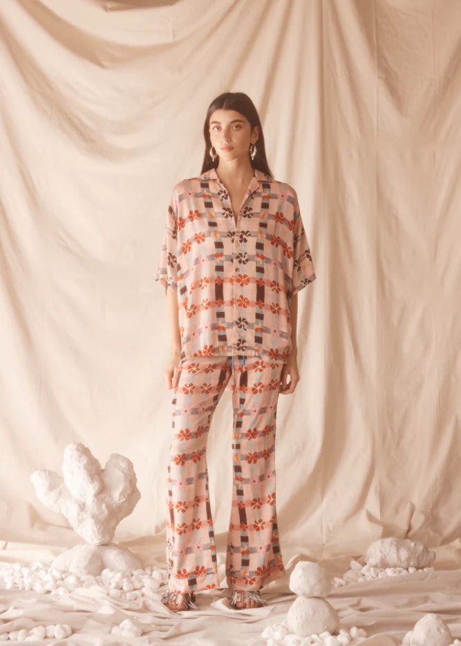 The Cuore Lae Shirt in soft blush by Kinga Csilla is a refined expression of artisanal resort wear and timeless elegance. This oversized button-up features a captivating geometric floral print that feels both nostalgic and contemporary. Cut with a generous silhouette and crafted from soft viscose, this piece drapes beautifully. Pairs effortlessly with the matching pants for a complete look, or styled solo for relaxed sophistication.
