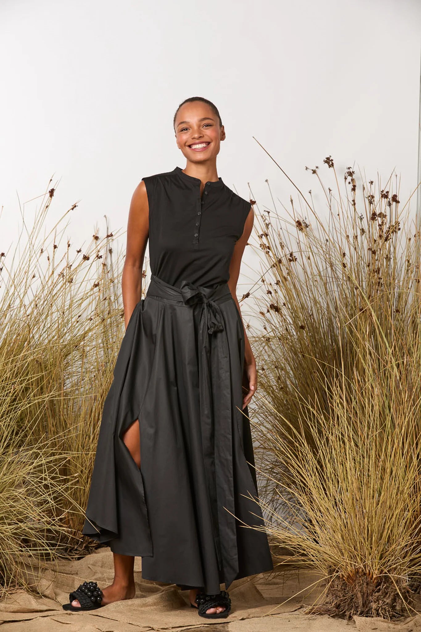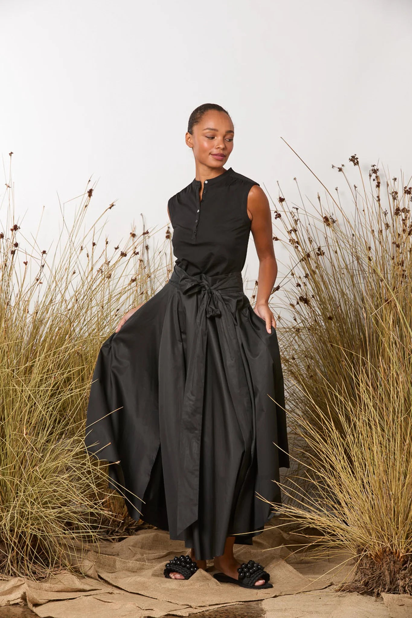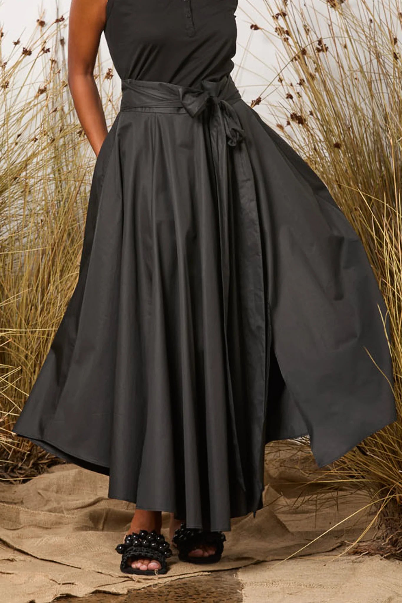 Crafted from 100% crisp cotton with a subtle sheen, the Gloria Skirt offers a sculptural yet breathable feel, perfect for trans-seasonal styling. A wide self-tie belt cinches the waist for a custom fit, while deep side pockets add practicality without compromising polish.