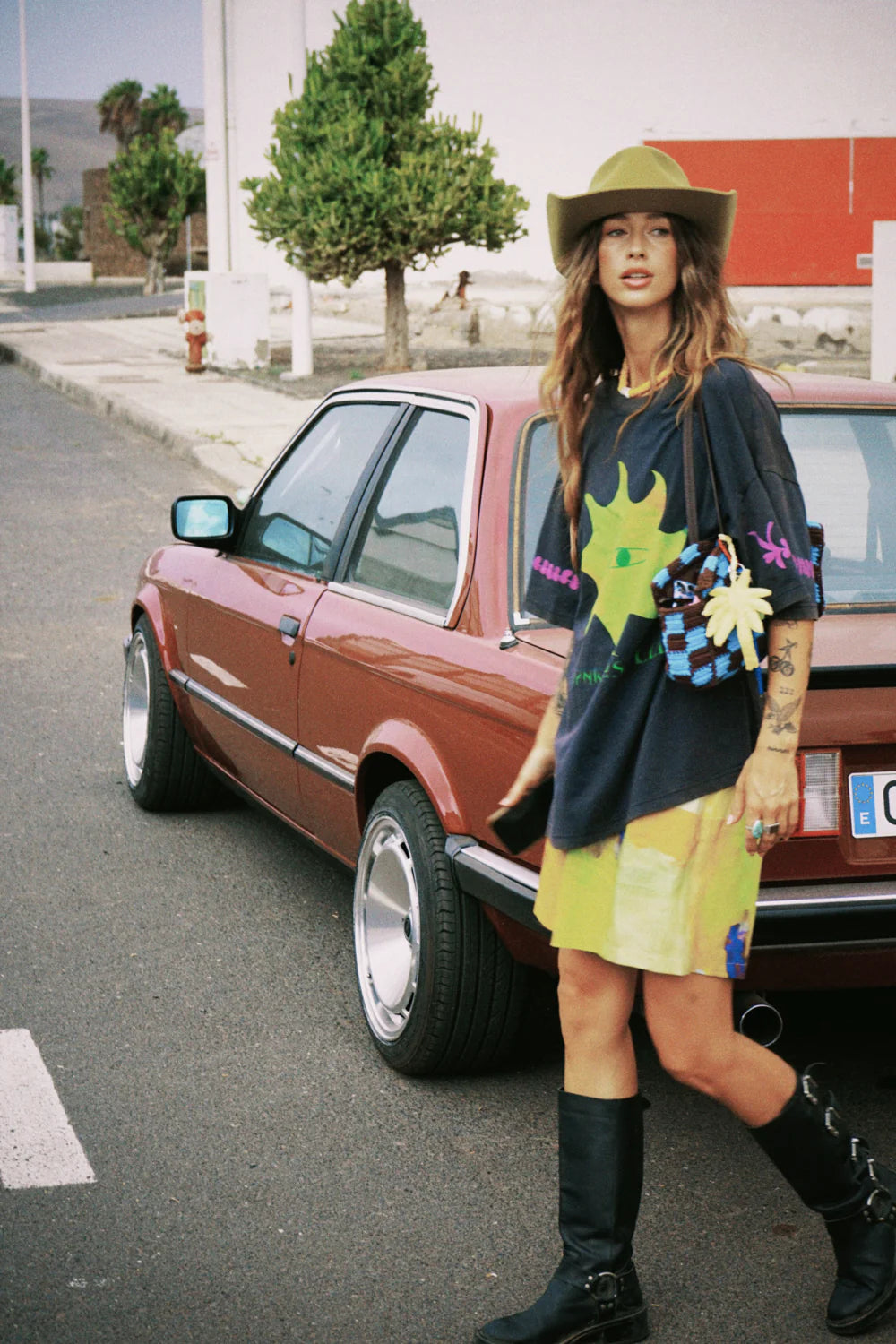 Screen-printed on heavy washed cotton, this oversized tee features original artwork by Kate Eliza, a surreal botanical motif that celebrates self-expression, freedom, and play.