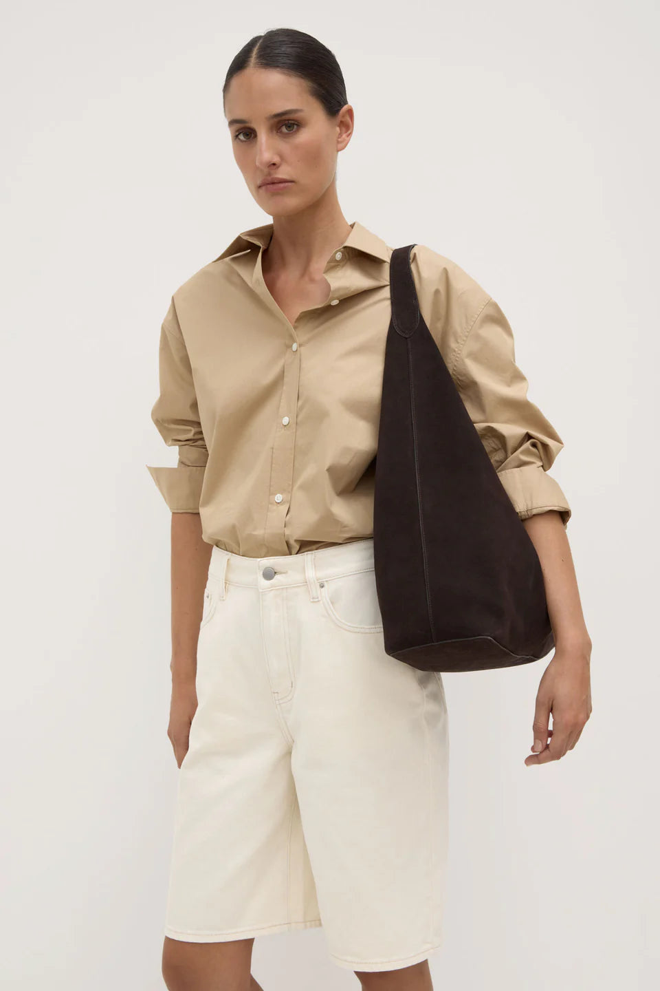 The Neve Suede Shoulder Bag in Ganache by Assembly Label. Relaxed everyday shoulder bag crafted from a textured suede leather. Features a structured base and reinforced handle to maintain form, as well as an internal patch pocket for storing essentials.